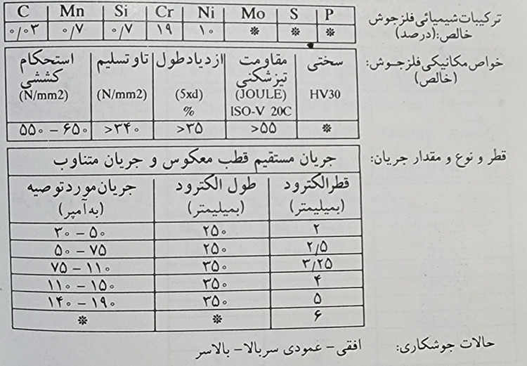 موارد مصرف: فولاد های کرم نیکل 18*8 اعم از معمولی و کم کربن و همچنین آن هایی که با نیوبیوم و یا تیتانیوم ثابت شده اند.